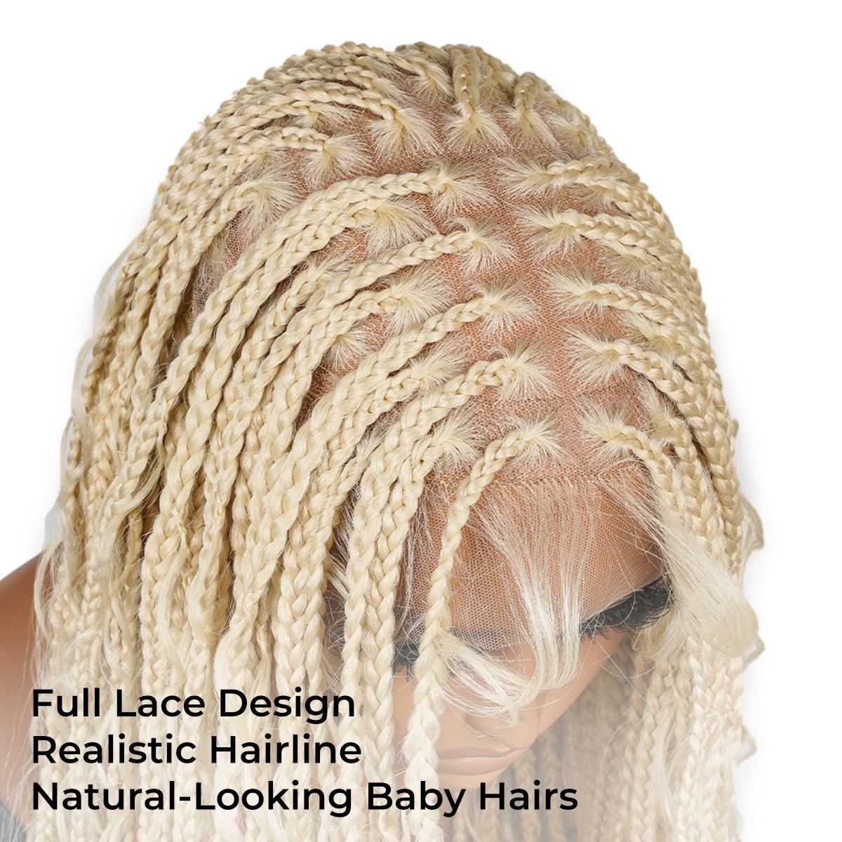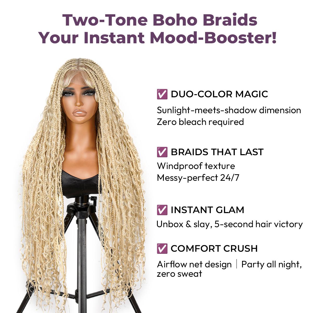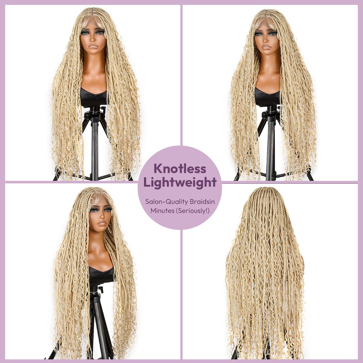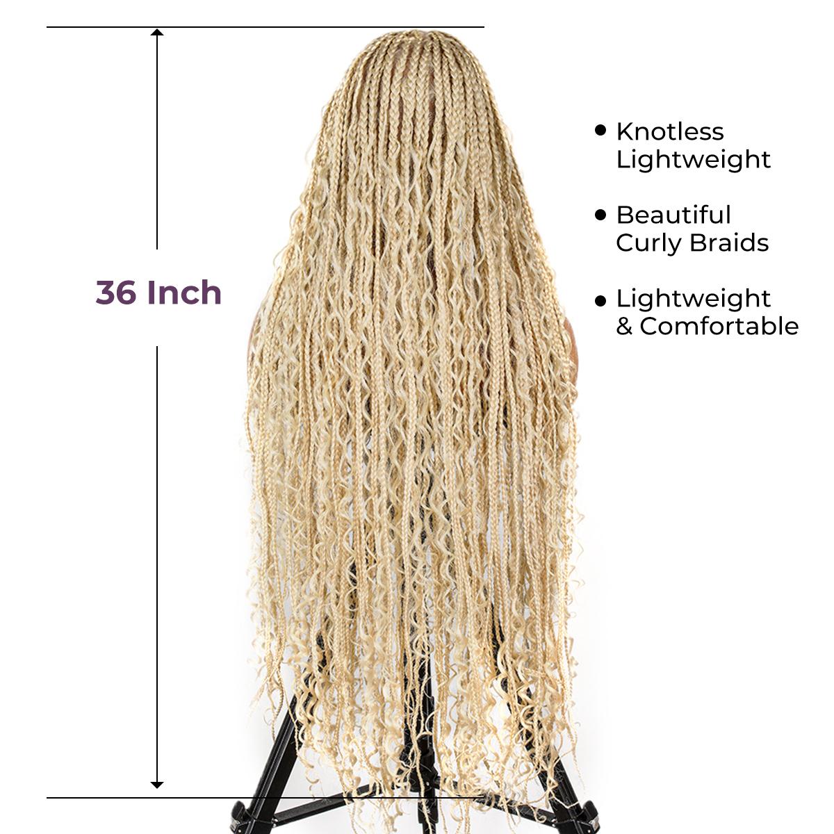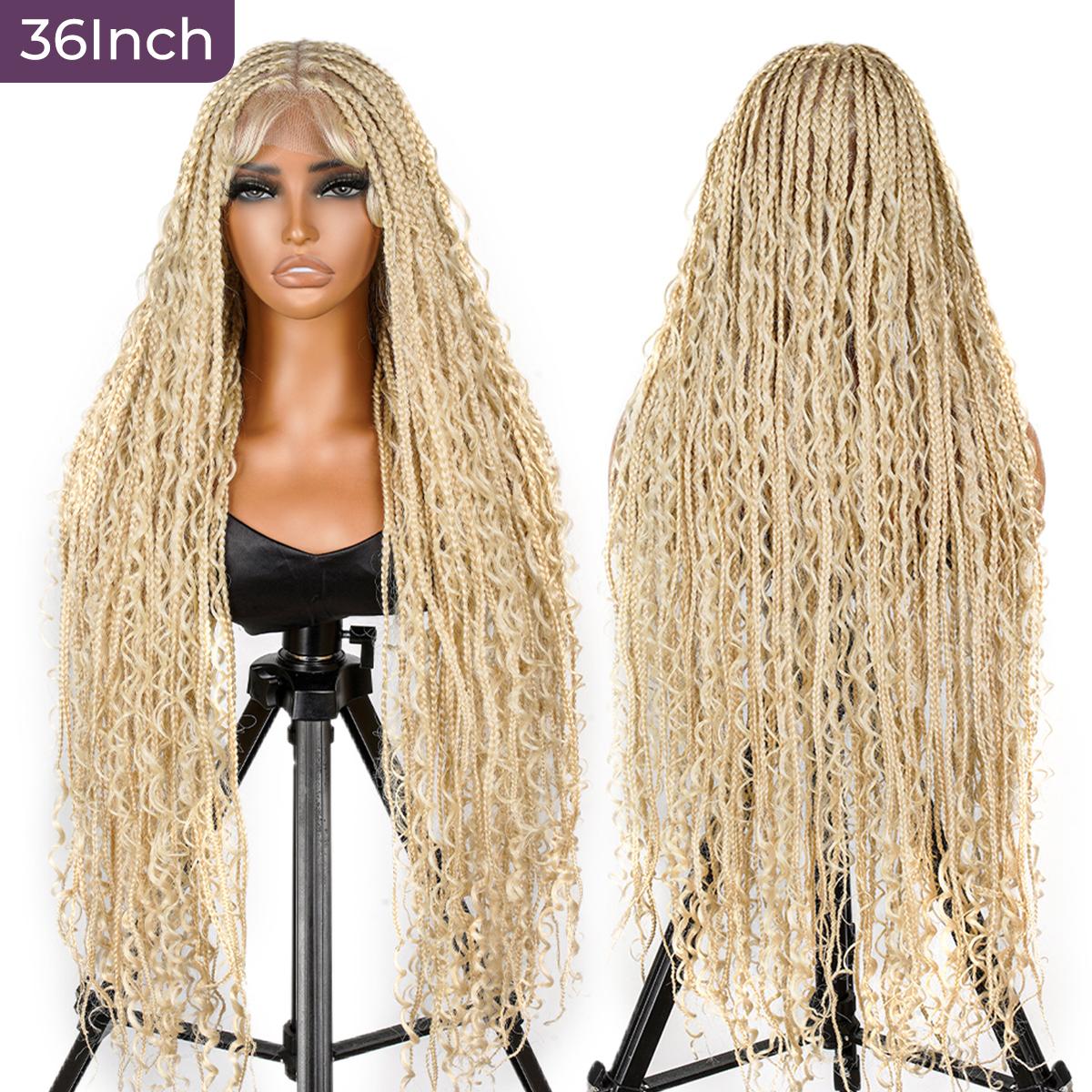 Material Soft Lace& Super Lightweight High-Quality Synthetic Fibers Natural Look Super Lightweight Knotless Lace Braided Wigs Type Full Lace Boho Braids Wig Length 36inch Versatile Dress It Up For Occasions Or Casually For Everyday Use. Easy to Wear & Go Only Few Minutes Needed New Fashion Knotless Braided Wigs For Black Women. Full Lace Full lace area, lace assures the softness and comfort of wearing With baby hair Natural baby hair creates a seamless transition Save Time and Money Get a perfect braided look under 15 mins 36inches knotless box braids design Stylish and Classic Enhance your look with the SuperNova 36-Inch #613 Blonde Box Braided Wig with Curly Ends, a stunning high-density full lace braided wig perfect for women.